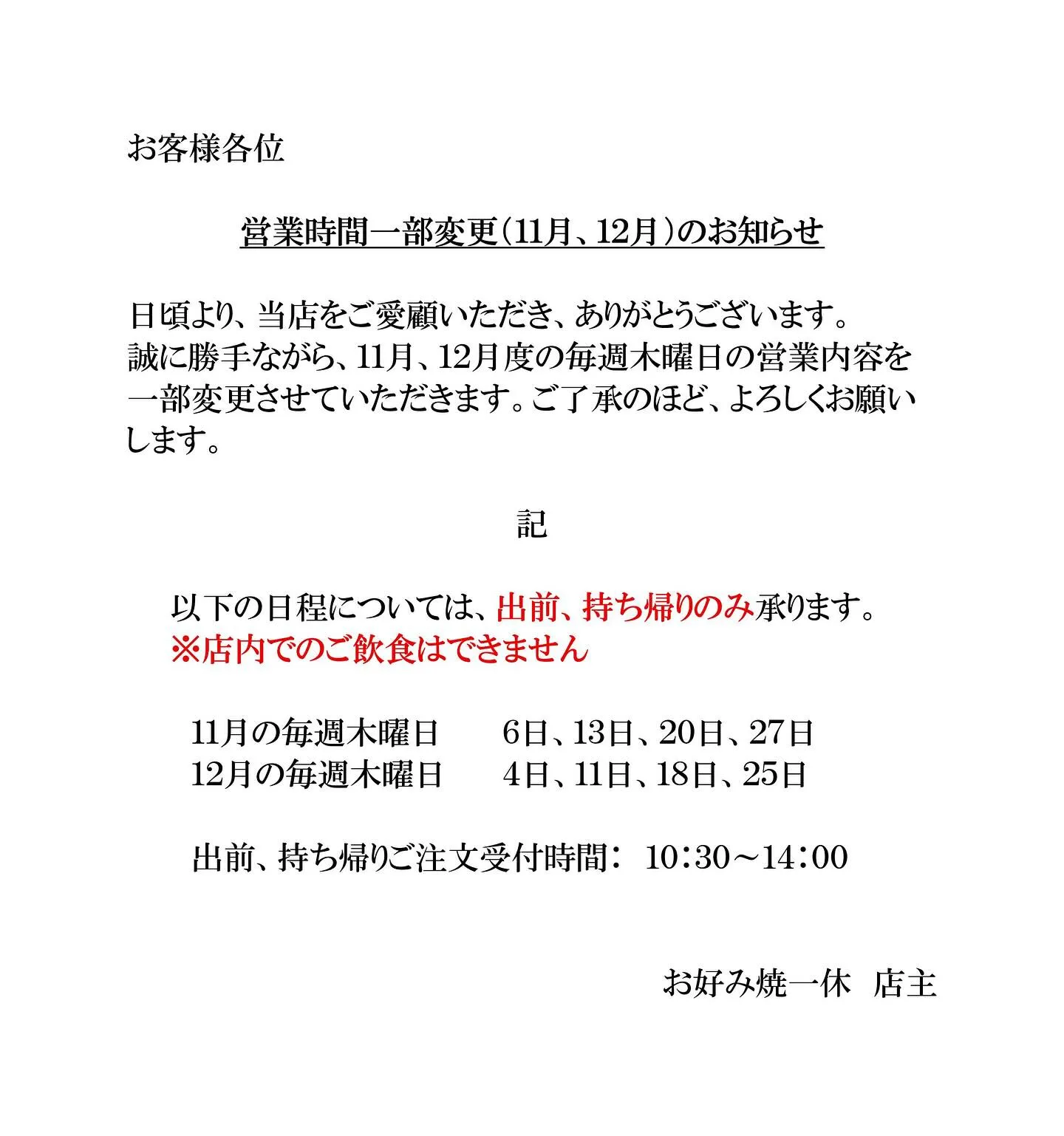 #お好み焼一休 #営業時間 #営業時間変更のお知らせ